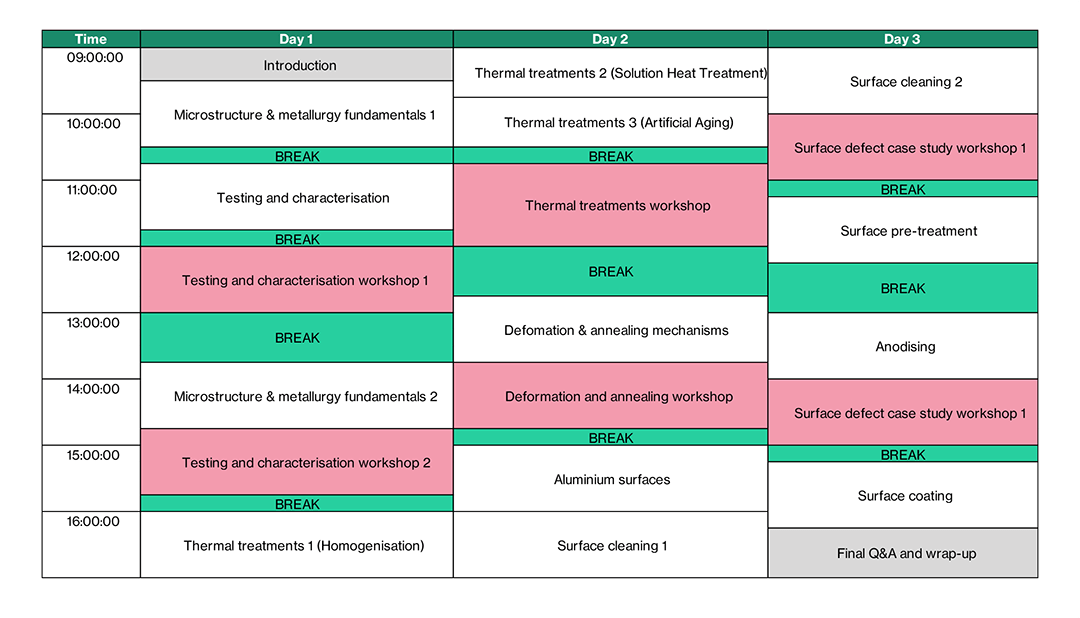 This is a 3-day, in-person aluminium training course. However, bespoke and live online versions are available on request.
