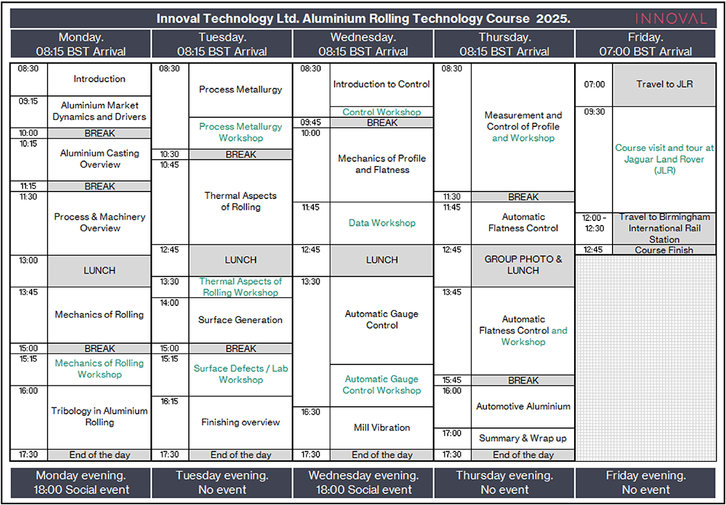 The course is primarily designed for engineers and managers who work in aluminium rolling. However, it would also benefit managers requiring an up-to-date overview of quality-improving technology, as well as engineers new to the field of rolling.